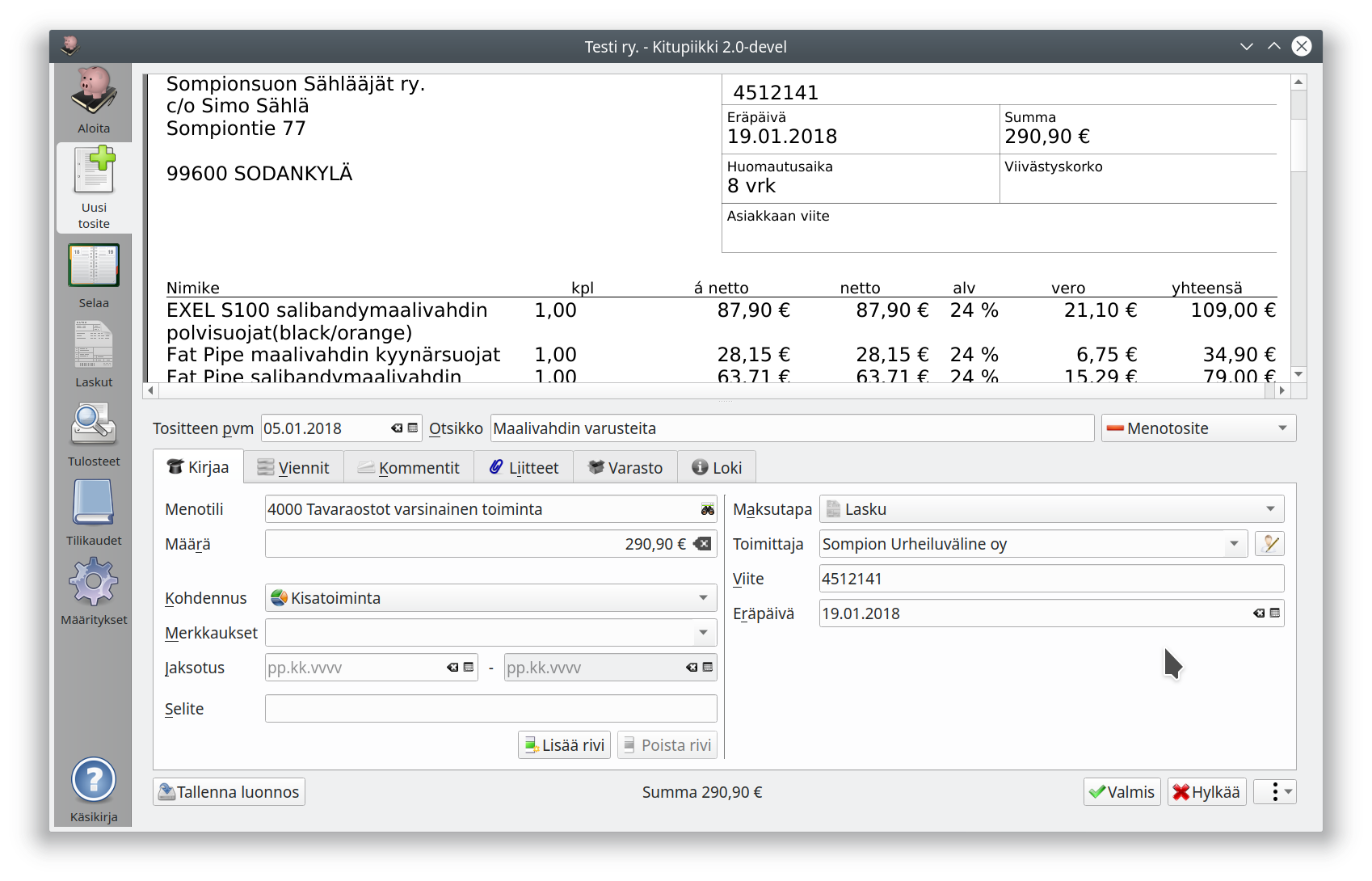 Kuvasta näkyy myös, että ohjelmaan tulee Asiakas- ja toimittajarekisteri. Tositteen pääsee tallentamaan myös luonnoksena. Jaksotuksella hallitaan meno- ja tuloeriä, jotka vaikuttavat vielä seuraavallekin tilikaudelle.