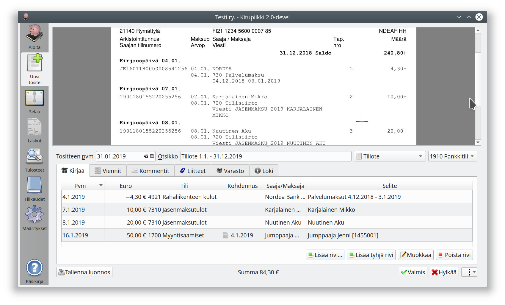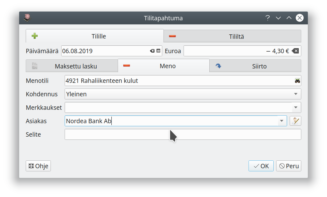 Tilitapahtumien kirjaamisessa käytettävä ikkuna tosin taitaa kaivata vielä pientä hiomista selkeyden ja käytettävyyden osalta...